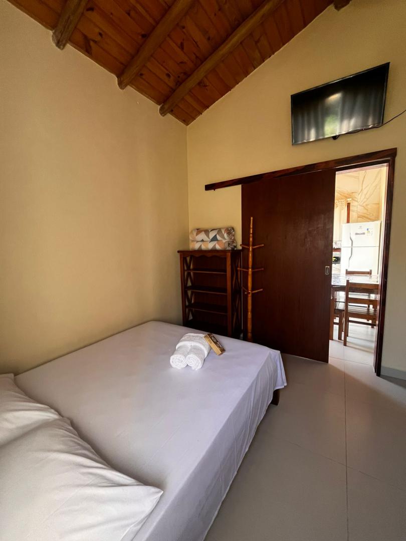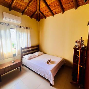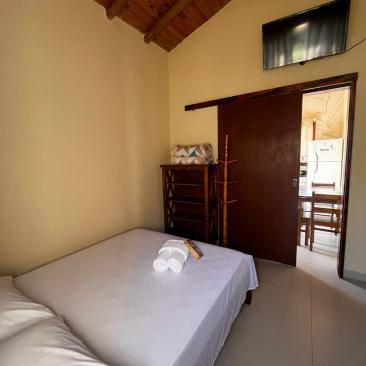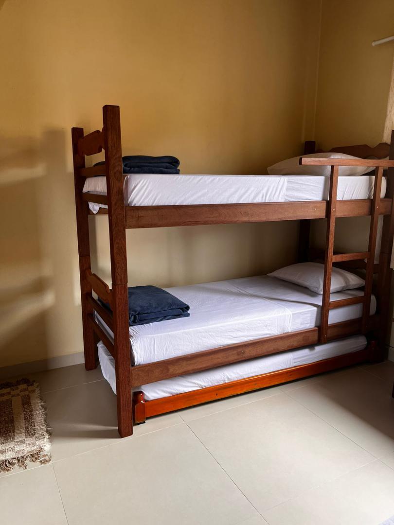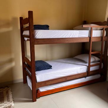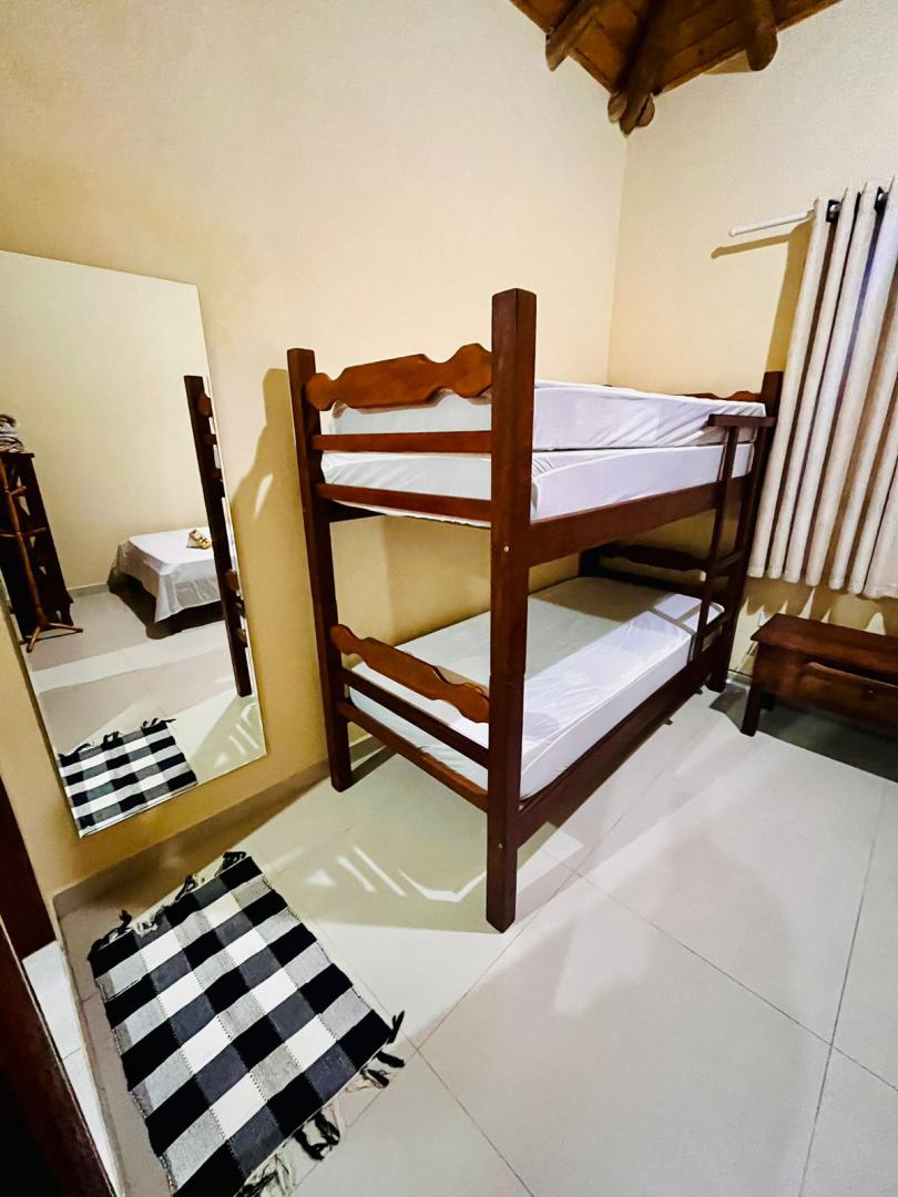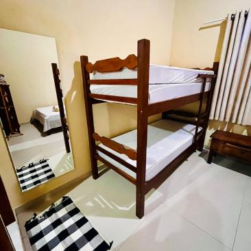 1 quarto com cama de casal ,uma beliche e uma cama auxiliar .