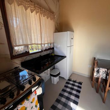 1 cozinha equipada com geladeira ,fogão ,microondas,e utensílios ..
